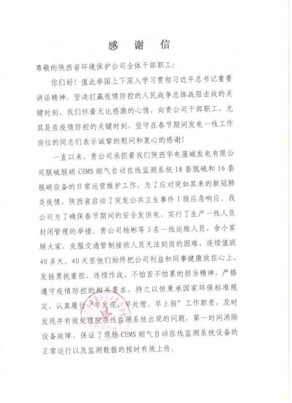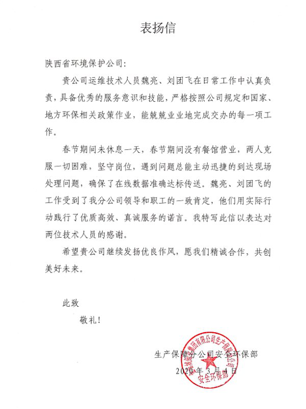 為打贏疫情防控阻擊戰(zhàn),環(huán)保公司自疫情發(fā)生以來,積極響應(yīng)集團公司黨委號召,一手抓防疫,一手抓生產(chǎn),全力以赴投入到戰(zhàn)疫情、保運維的工作當(dāng)中,保障了全省23家企業(yè)194套污染源在線監(jiān)測設(shè)備、30余個水質(zhì)自動監(jiān)測站數(shù)據(jù)的穩(wěn)定有效上傳,同時延安甘谷驛甲醇污水處理、天藍(lán)公司延安南區(qū)供熱、垃圾填埋場滲濾液處理等民生項目安全穩(wěn)定運行,有力展示了國企擔(dān)當(dāng),履行了社會責(zé)任。連日來,陸續(xù)受到省生態(tài)環(huán)境廳、各地市生態(tài)環(huán)境局和服務(wù)企業(yè)的表揚認(rèn)可。大唐陜西發(fā)電公司渭河熱電廠、陜西華電蒲城發(fā)電公司、金堆城鉬業(yè)集團等企業(yè),紛紛向環(huán)保公司發(fā)來感謝信,充分肯定環(huán)保公司運維團隊攻堅克難、團結(jié)協(xié)作、銳意進取的企業(yè)精神和想客戶之所想、急客戶所急的服務(wù)理念。