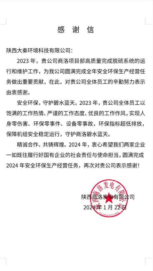 2023年,商洛項目公司#1、#2機組累計減排SO?21814.82噸,累計減排粉塵525.6噸,全年無環保超標事件,機組安全穩定運行,為守護商洛的碧水藍天作出了應有貢獻。來信既是對大秦公司工作的認可,也是對商洛項目公司全體職工下一階段工作的鼓勵和鞭策,大秦公司將一如既往踐行國有企業的社會責任和使命擔當,持續打好藍天保衛戰,努力實現“凈化環境,共享健康”目標。(劉寧)